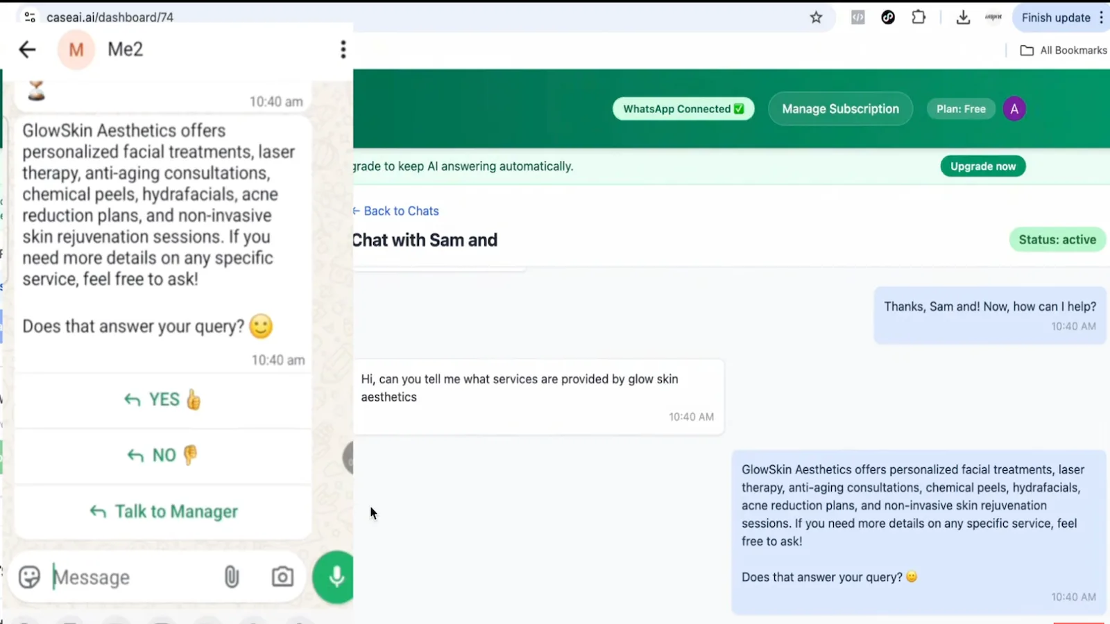 Your AI receptionist that answers WhatsApp customers 24/7 using your own business documents.